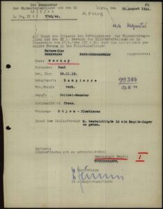 Après avoir subi des interrogatoires, un ordre d’internement fut émis le 22 août à destination du camp de concentration de Natzweiler-Strutof (Alsace annexée) où il arriva le 4 septembre.