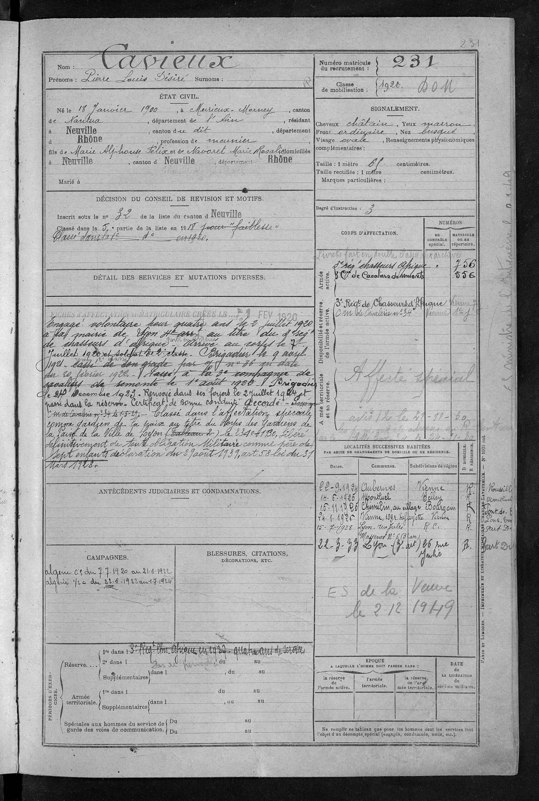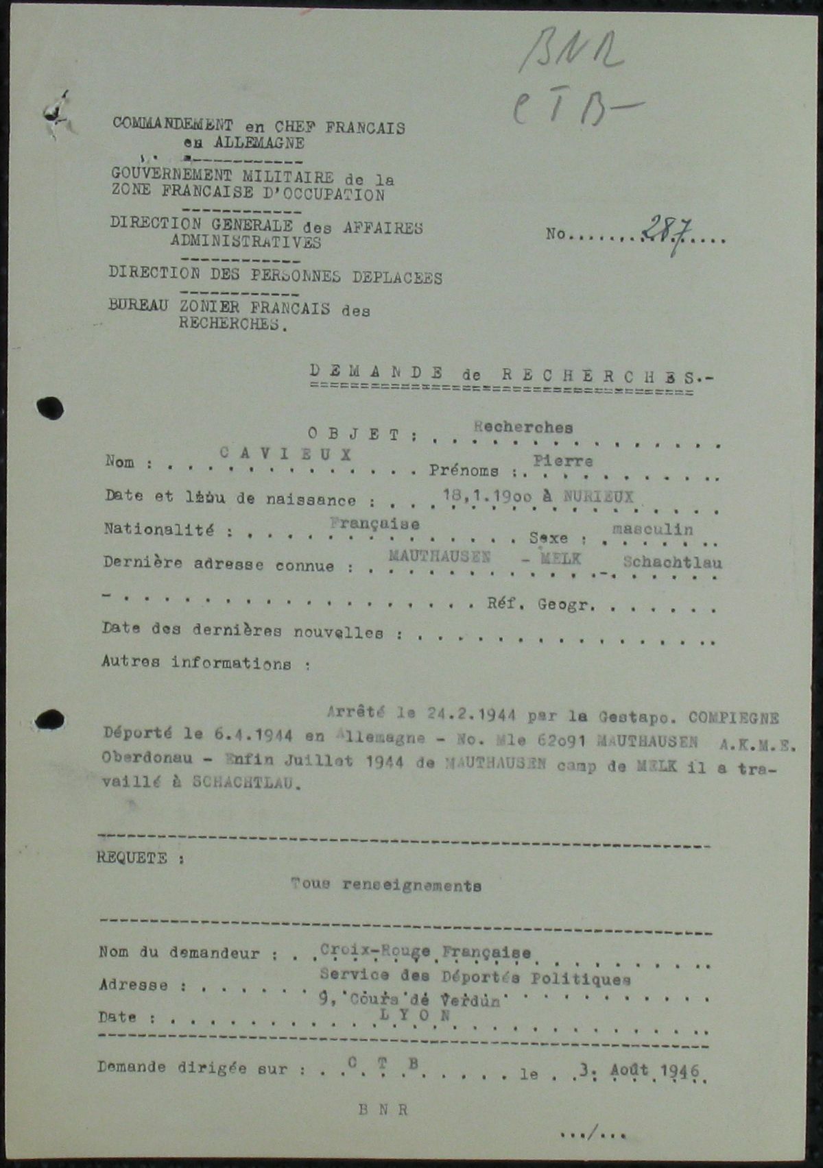 Le 24 février 1944, le gardien de la paix Pierre Cavieux, quarante-quatre ans, affecté au poste de police de l’Antiquaille dans le 5e arrdt de Lyon (Rhône), est arrêté par les allemands dans le contexte de l’Occupation. Il est accusé de détention de produits explosifs, de complicité d’acte de terrorisme et d’affiliation à un groupe de Résistance, pour laquelle il oeuvrait effectivement comme agent auprès du réseau de renseignement militaire Gallia (voir biographie.