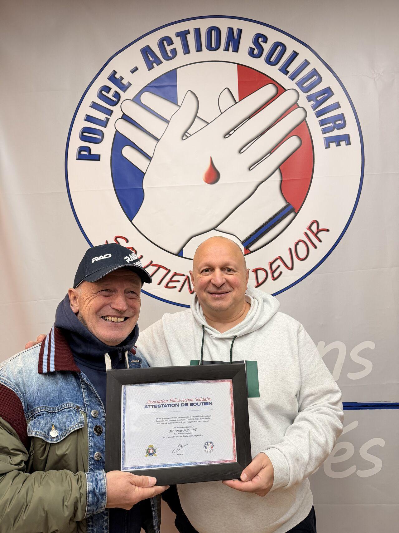 Nous avons eu le plaisir de remettre une attestation de membre bienfaiteur à Bruno POMART pour son généreux don à notre association. Son engagement contribue directement au soutien de notre Grand Concert Hommage aux policiers victimes du devoir qui a lieu tous les ans.